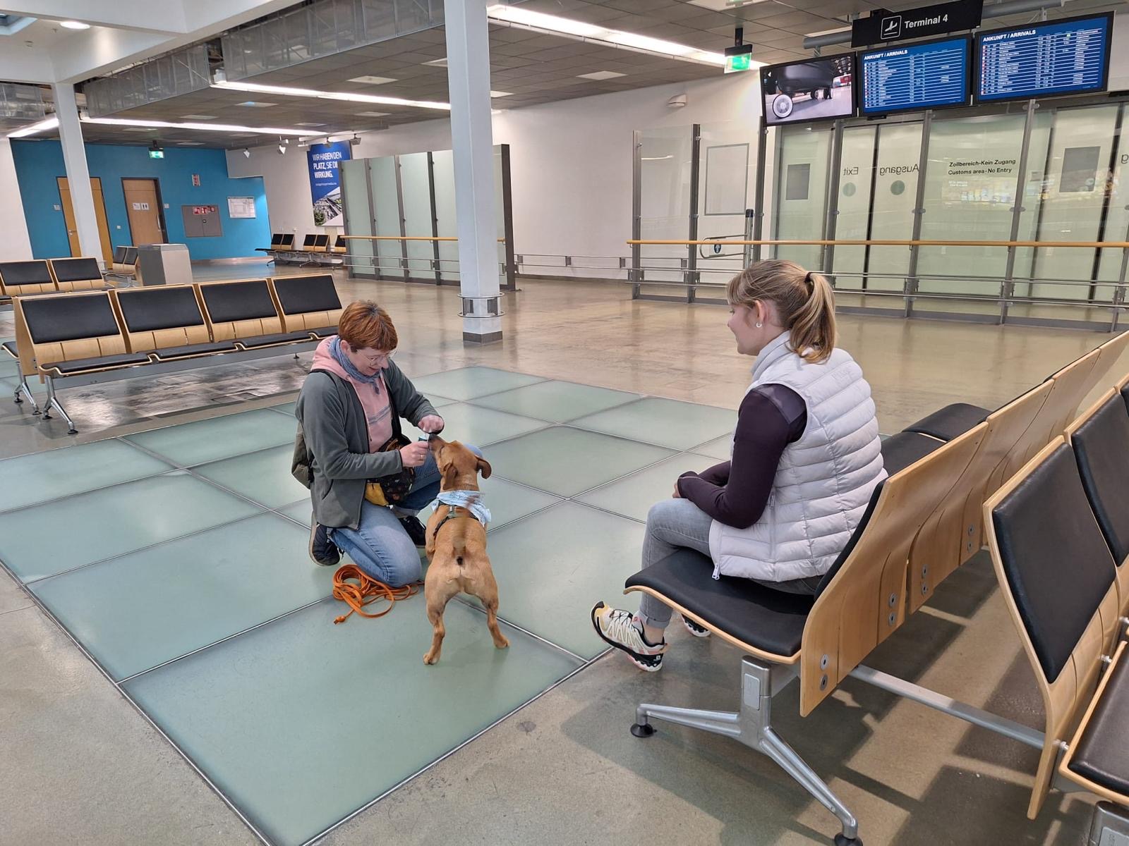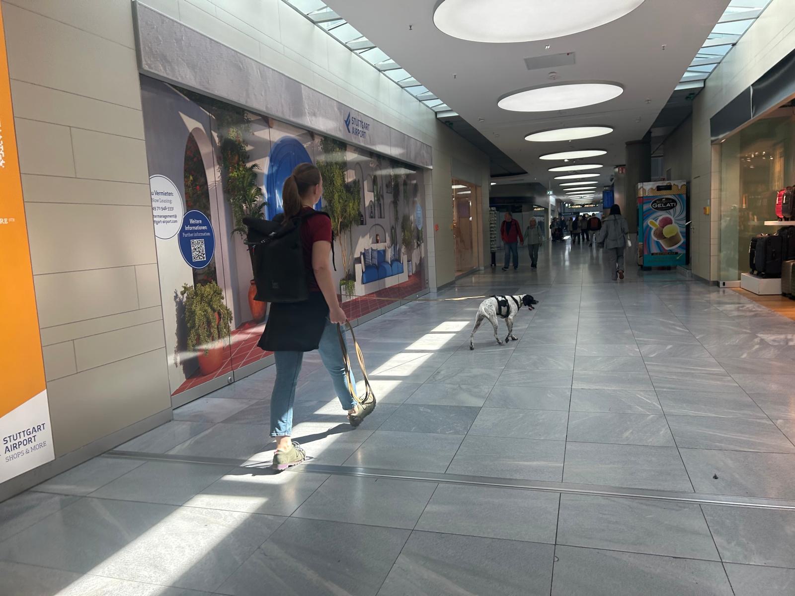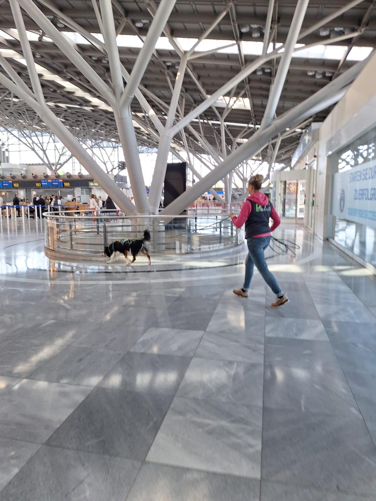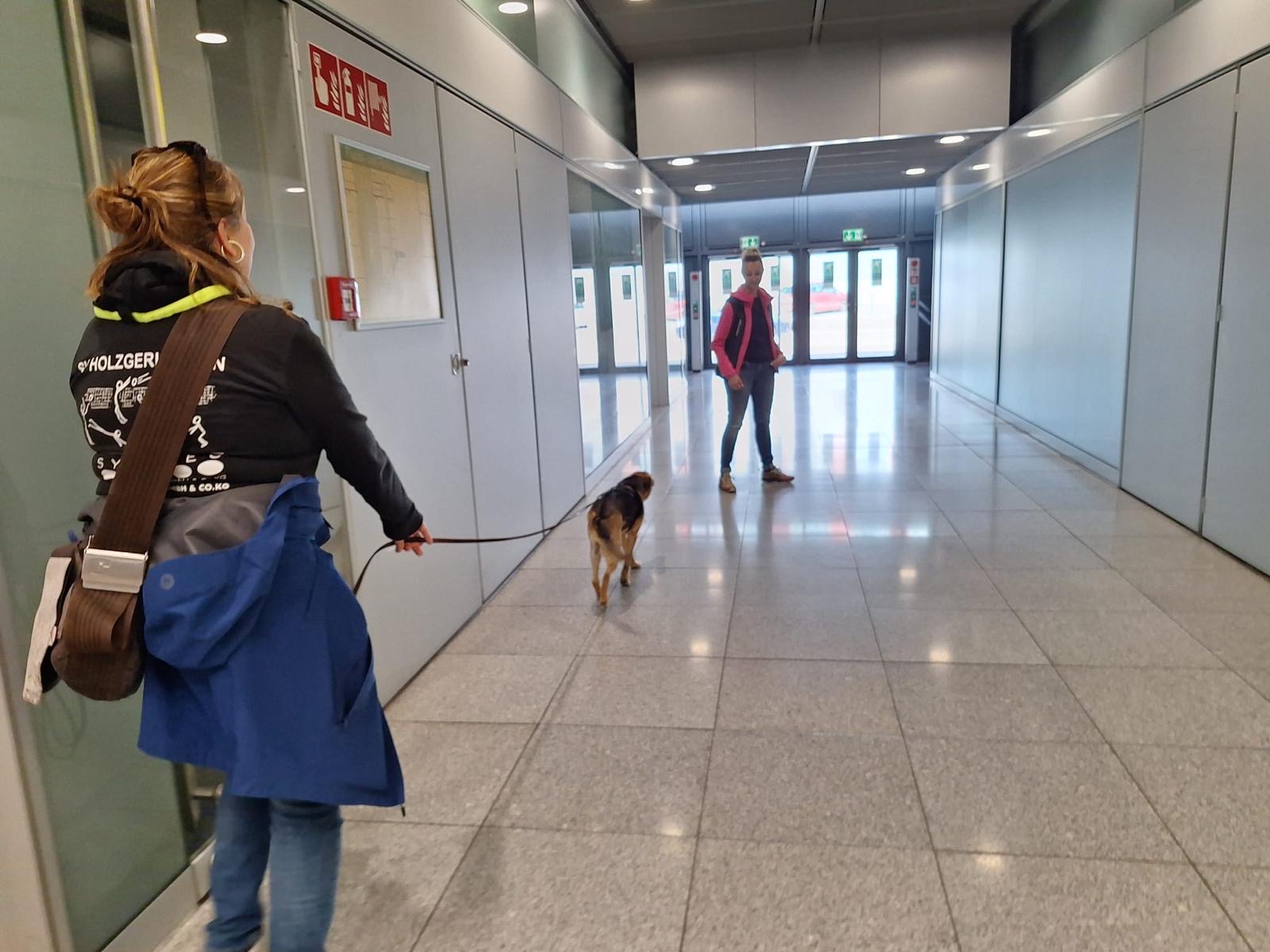 Der Flughafen bot eine Vielzahl unterschiedlicher Untergründe und Reize: von glatten Böden in den Gebäuden bis hin zu belebten Bereichen mit hohem Personenaufkommen. Gerade diese Vielfalt macht das Taining wertvoll, da die Hunde lernen konnten, sich auch unter schwierigen Bedingungen auf ihre Nasenarbeit zu konzentrieren.