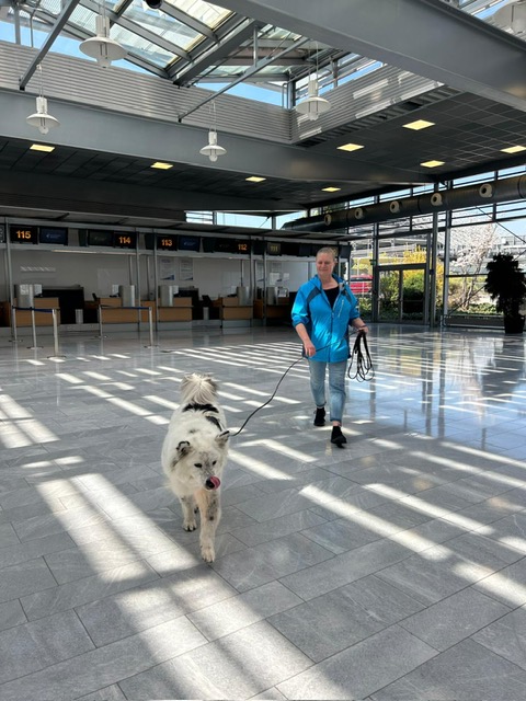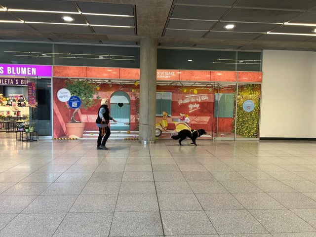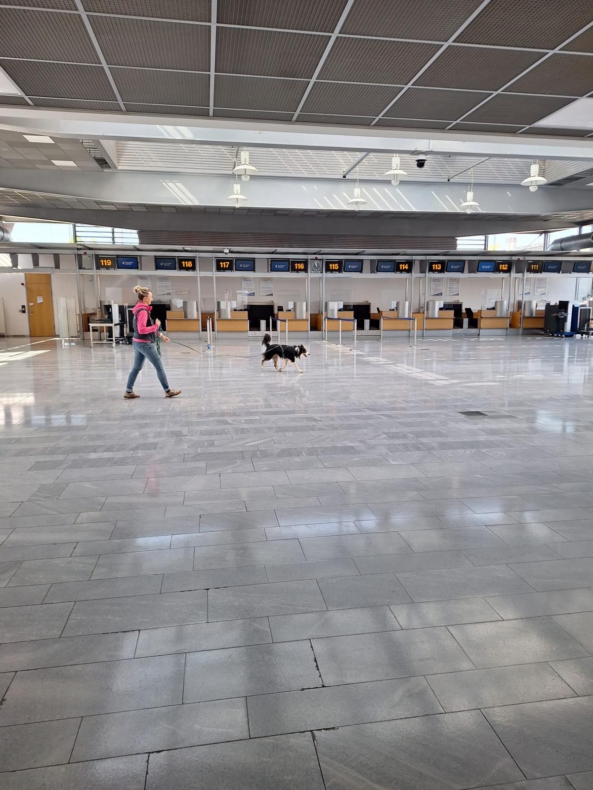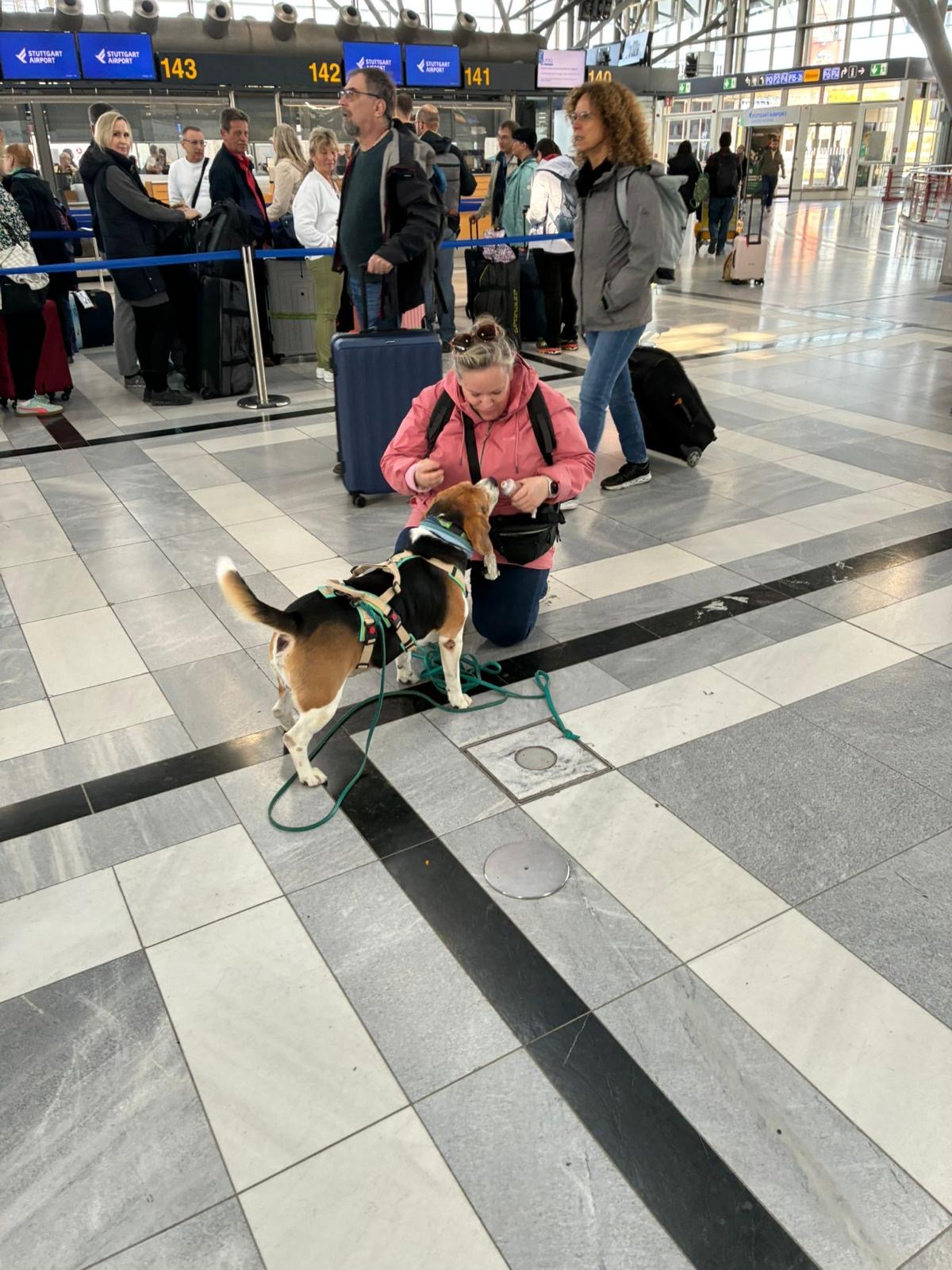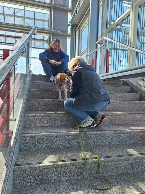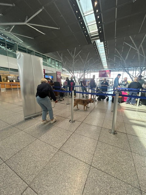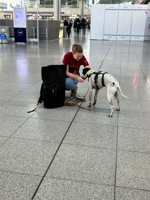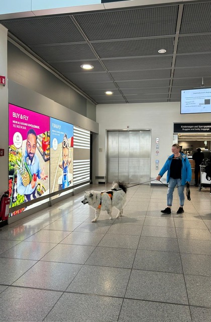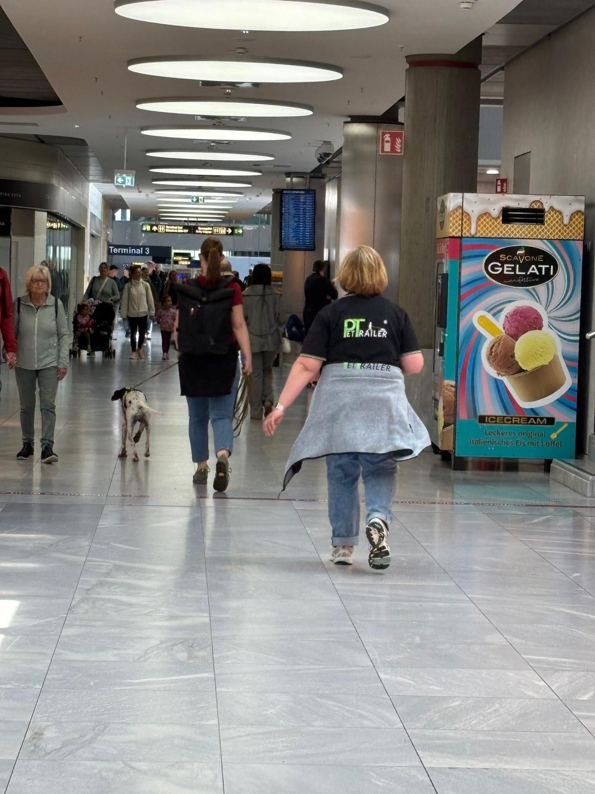 Der Flughafen bot eine Vielzahl unterschiedlicher Untergründe und Reize: von glatten Böden in den Gebäuden bis hin zu belebten Bereichen mit hohem Personenaufkommen. Gerade diese Vielfalt macht das Taining wertvoll, da die Hunde lernen konnten, sich auch unter schwierigen Bedingungen auf ihre Nasenarbeit zu konzentrieren.